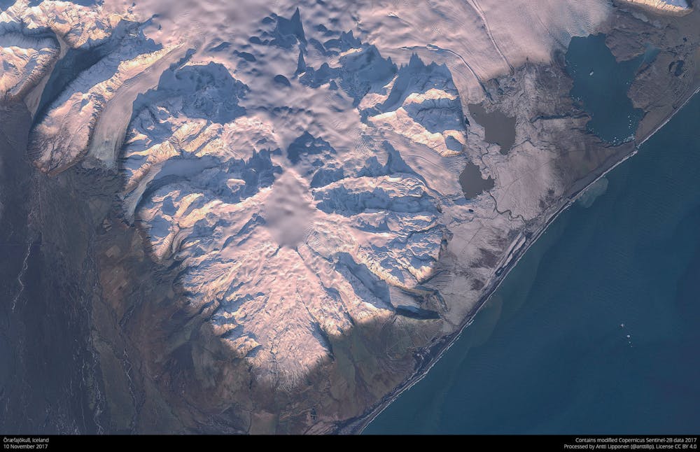 | Öræfajökull on November 10. The fuzzy area in the middle indicates melting ice. Antti Lipponen / Sentinel–2B, CC BY-SA |