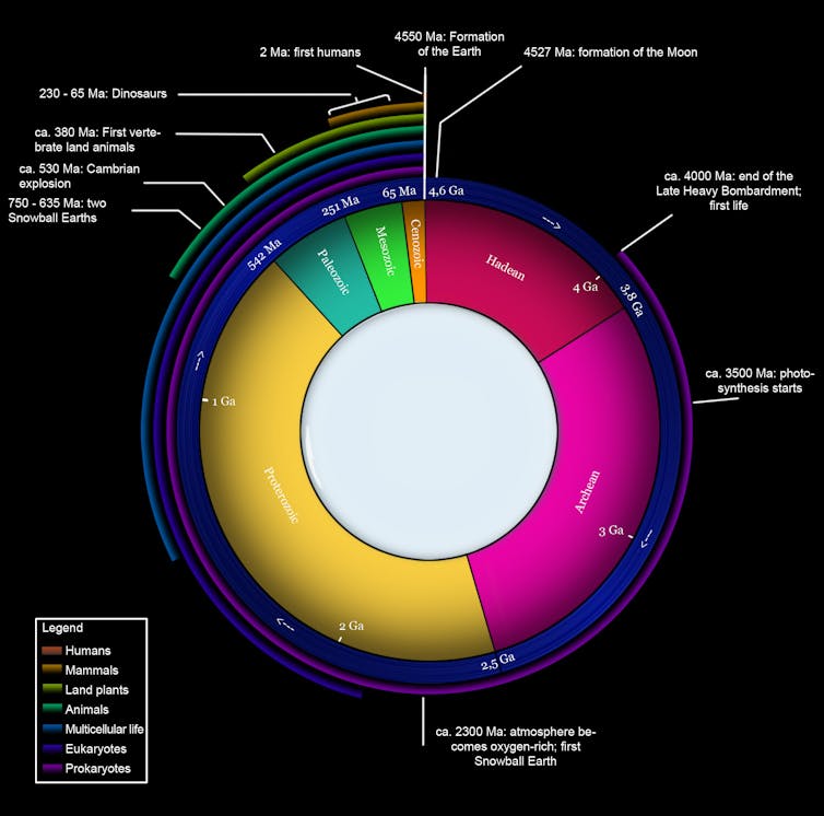 | Geologic clock: if Earth’s history is plotted over 12hrs, not much happened between about 7 and 10 o'clock. Woudloper / wiki, CC BY-SA |