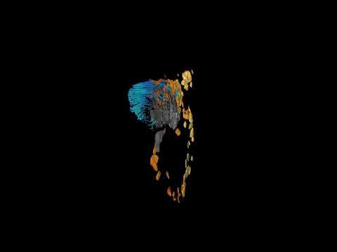 An animation of the pectoral fin of Qikiqtania showing how it was preserved in the rock. Scales are shown in yellow, fin rays in blue, and the endoskeleton in grey. Credit: Tom Stewart